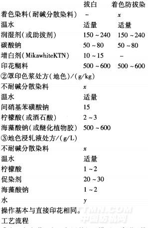 工藝流程易拔分散染料染地色一印花(拔白漿或著色拔染漿)一烘干一汽蒸固著(13O℃,3Omin或17O~180℃,7—1Omin)一冷水淋洗一熱水洗(或還原清洗)一水洗一烘干