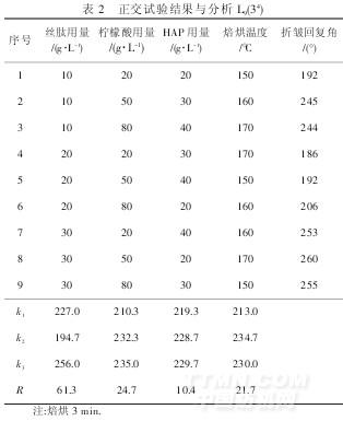 綜合折皺回復(fù)角、白度、撕破強(qiáng)力各項(xiàng)指標(biāo)認(rèn)為,絲肽/檸檬酸體系最適于作為絲綢的抗皺整理劑,故設(shè)計(jì)正交試驗(yàn),優(yōu)選絲肽/檸檬酸整理柞蠶絲綢的最佳工藝參數(shù).