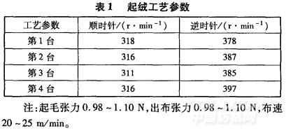 使用MB331E型起絨機(jī)雙彎針平板面起絨機(jī)4臺(tái),工藝參數(shù)見表l。