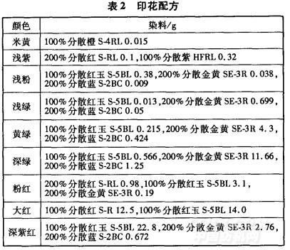 以花號(hào)E081104-9為例,工藝處方見表2。表2配方中,均加人增稠劑0.05kg,滲透劑0.03kg,消泡劑0.O1kg。
