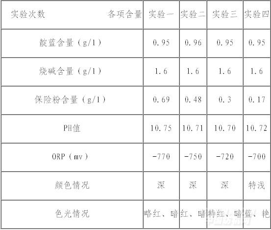 保險粉因其具有超強的還原能力,一直作為還原染料染色的還原劑,更是靛藍染色過程中的常用還原劑。根據(jù)車間實際生產(chǎn)情況,本組實驗分四次完成,在其它參數(shù)(靛藍含量、燒堿含量、車速、軋車壓力等)基本不變的條件下,約以0.2的等差降低染液保險粉含量,研究靛藍染色過程中顏色和色光的變化。