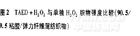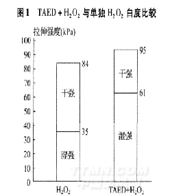 由于TAED具有低溫漂白作用,促進了纖維素纖維、蛋白質(zhì)纖維等紡織品的低溫氧漂工藝的應(yīng)用[3-6],在低溫條件下白度明顯高于單獨使用雙氧水,減少纖維在高溫下的損傷程度[7]。圖1和圖2顯示TAED+H2O2和單獨H2O2的白度值和拉伸強度的比較。它們是在pH=10·5,溫度70℃, 1小時氧漂工藝條件下的結(jié)果。