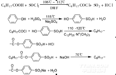 NOBS的分子結(jié)構(gòu)如下,CASNo: 91125-43-8NOBS是由壬酸在DMF催化劑存在下與二氯亞砜反應(yīng)生成壬酰氯;苯酚與濃硫酸反應(yīng)得到對羥基苯磺酸;然后,該二生成物在叔胺存在下得到壬酰氧基苯磺酸,中和為鈉鹽[13]。反應(yīng)如下:
