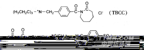 繼TAED和NOBS之后,又開發(fā)了陽離子型季銨鹽類過氧化物的活化劑品種,美國北加州大學(xué)紡織學(xué)院和土耳基伊斯坦堡大學(xué)對陽離子活化劑的合成和應(yīng)用進行了研究。在N-?;簝?nèi)酰胺(N-AcylCaprolactam)類中,已開發(fā)應(yīng)用的2只品種為:N 4(三乙基銨甲撐)苯?;簝?nèi)酰胺氯化物(N 4(TriethylAmmoniomethyl)benzoyl caprolactam chloride,簡稱TBCC)和6 N,N,N-三甲基銨甲撐己酰基己內(nèi)酰胺對甲苯磺酸(6 N,N,N-Trimethylam-monio hexanoyl caprolactam p-toluenesulfonate,簡稱THCTS)。它們的分子結(jié)構(gòu)式如下: