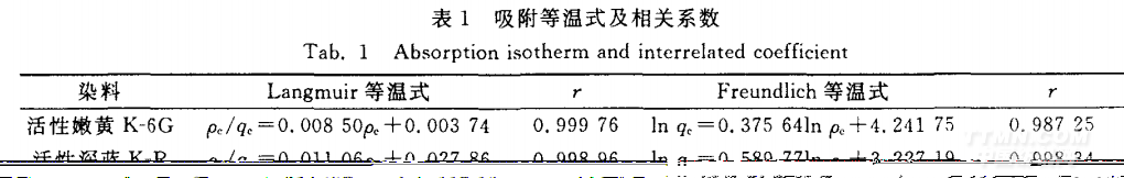 方程可表示為: qe/P e一1/(bq max。 +P e /qmax);Freundl—ich方程可表示為:inqe一InK+ … In P e。式中qmax為單層飽和吸附量;b,k,n 均為常量。 由實(shí)驗(yàn)數(shù)據(jù)擬合 得到的活性深藍(lán)K—R、活性嫩黃K一6G的吸附等溫式及相關(guān)系數(shù)r見(jiàn)表1。