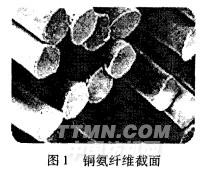 銅氨纖維以棉籽絨為原料,溶解在氫氧化銅或堿性銅鹽的濃氨溶液內(nèi),配成紡絲液,經(jīng)濕紡而制成再生纖維素纖維。它擁有近似圓形的截面(圖1),表面多孔,無(wú)皮芯結(jié)構(gòu),具有優(yōu)異的染色性、吸濕性和樹(shù)脂加工性,以及鮮明的顯色性和真絲般的光澤。結(jié)合銅氨纖維的特點(diǎn)及色織襯衫紡織品的要求,將棉與銅氨纖維混紡,開(kāi)發(fā)了棉/銅氨混紡色織面料,該產(chǎn)品光澤亮麗、手感柔軟、懸垂感強(qiáng)。