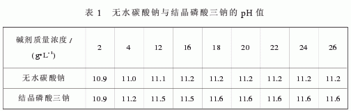 純堿的堿性較溫和,它的化學(xué)特性適于活性染料染色,它的水溶液在一個(gè)比較廣的單位濃度范圍內(nèi)其pH值變化不大。磷酸三鈉也有此特性,只是它的堿性要比純堿強(qiáng)。不同質(zhì)量濃度的堿劑pH值見表1.