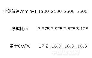 由于過高的塵籠速度會(huì)影響紡紗的加捻效率,因此,在摩擦比不變的情況下,提高紡紗速度,成紗捻度會(huì)隨之下降,所以紡紗速度應(yīng)根據(jù)塵籠轉(zhuǎn)速的高低來選擇,不同的紡紗機(jī),其速度范圍不同,