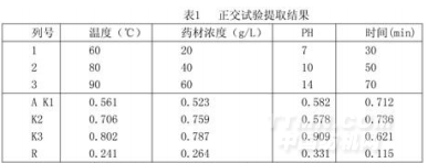 將影響工藝的幾個(gè)主要因素設(shè)計(jì)正交試驗(yàn)表,依照其正交試驗(yàn), 試驗(yàn)結(jié)果(將提取液稀釋100倍, 在380nm處測(cè)其吸光度)。
