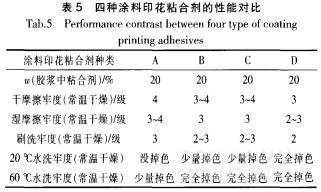 采用相同的配方制備紡織印花膠漿(僅交聯(lián)劑不同),然后在相同條件下(常溫干燥24h)對印花產(chǎn)品進(jìn)行性能測試,則四種涂料印花粘合劑的性能對比如表5所 示。其中A為常溫交聯(lián)單體LEG合成的涂料印花粘合劑,B為丁氧基丙烯酰胺低溫交聯(lián)單體制成的涂料印花粘合劑,C為水性丙烯酸酯和PU接枝聚合而成的涂料 印花粘合劑(PUA),D為~一羥甲基丙烯酰胺為交聯(lián)單體的涂料印花粘合劑。