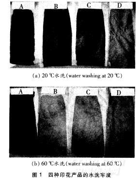 由表5可知,在常溫干燥24h的情況下,A性能最好、D性能最差。這是因?yàn)镈中的Ⅳ一羥甲基丙烯酰胺為高溫交聯(lián)單體,它只有在l50~170℃焙烘后才能 完全交聯(lián)成膜;因此,在室溫干燥的情況下D很難達(dá)到交聯(lián)成膜,其印花產(chǎn)品的牢度自然會受到影響。B和C只有在80~100℃焙烘后才能完全交聯(lián)成膜,而在 室溫干燥的情況下只能部分交聯(lián)成膜,因此,其印花產(chǎn)品的牢度比D好。A是用常溫交聯(lián)劑制備的印花粘合劑,在常溫干燥的情況下就能達(dá)到完全交聯(lián)成膜,因此, 其印花產(chǎn)品的各項(xiàng)性能最好(見圖1)。