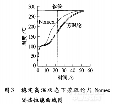 圖3是在外界溫度保持在270 c《=時(shí),同時(shí)測(cè)試Nomex纖維和芳砜綸纖維包覆下的空氣溫度的變化情況。由圖3可知,在纖維內(nèi)溫度上升的過(guò)程中,同一時(shí)刻,芳砜綸纖維內(nèi)的空氣溫度要比Nomex纖維內(nèi)的空氣溫度低,最大溫度差為5O℃。