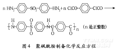 聚砜酰胺樹(shù)脂一般用界面或低溫溶液縮聚法:界面縮聚的單體活性高,反應(yīng)快,大部分反應(yīng)是在有機(jī)溶劑一側(cè)進(jìn)行,對(duì)單體純度和當(dāng)量比要求不嚴(yán)格,反應(yīng)主要與單體濃度有關(guān),因溶劑回收麻煩,應(yīng)用受限;低溫溶液縮聚法是均相聚合,所得到的聚合物分子量分散性較小,且可以直接制備紡絲漿液,工藝路線較短,操作方便,溶劑單耗低 ]。反應(yīng)方程式如圖4所示。