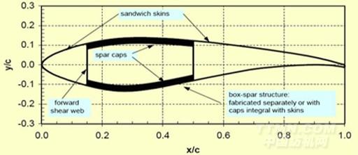 在風力發(fā)電領域,經編復合材料是制造風力發(fā)電葉片及其它重要結構部件的主要材料,葉片90%以上重量由復合材料組成。采用碳纖維NCF織物制備的復合材料風機葉片,具有質量輕、強度高、剛性好的優(yōu)點,能夠滿足開發(fā)大型化、輕量化、高性能、低成本的發(fā)電葉片的要求,如圖3所示為風機葉片,圖4為葉片結構。