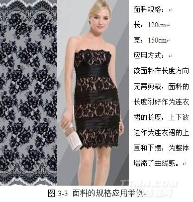 睫毛花邊面料一經設計,其幅寬和長度都是確定的。因此睫毛花邊面料在設計時需要充分考慮其用途。根據(jù)睫毛服裝面料的應用方式不同,睫毛服裝面料的規(guī)格設計也不同,主要是長度差異較大。比如,用于領子或袖口的睫毛面料,長度只需5-10cm,也稱為裝飾用睫毛花邊面料。當睫毛花邊作為單獨的上裝面料或下裝面料,如吊帶衫、半身裙時,睫毛花邊的高度一般根據(jù)服裝的長短設計,一般在30-60cm,剛好能夠充分利用睫毛花邊的上下波浪式睫毛邊,長度方向無需太多裁剪。作為裙子套裝或連衣裙的睫毛花邊,長度則需要滿足服裝的規(guī)格要求,一般在100-130cm之間,應用方法如圖3-3所示。睫毛花邊面料制作連衣裙時,面料的長度即是裙子的長度,上下睫毛邊分別為裙子上圍和下擺,制作簡單。而制作套裝群時,只需將睫毛花邊面料上下對裁,一分為二,兩個睫毛邊分別作為上衣下擺和短裙下擺。