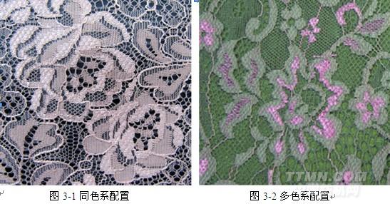多梳拉舍爾服裝面料的多色系配置就是利用不同種類的原料染色性能不同這一特點,在多梳拉舍爾服裝面料的生產過程中,采用多次染色的方法,使染色后的花邊呈現(xiàn)不同的色彩層次。如圖3-2為多色系配置效果。多梳拉舍爾服裝面料中常用的原料有錦綸、滌綸、粘膠、棉纖維等。錦綸使用酸性染料,常溫常壓染色;滌綸使用分散染料,高溫高壓染色;粘膠和棉纖維是天然纖維,采用直接染料,常溫常壓染色。