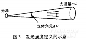 sr。因為球面的面積是4,rr2,所以整個球面的立體角為4 sr。發(fā)光強(qiáng)度的單位是坎德拉(candela),符號為cd。其定義的示意圖如圖3所示 。