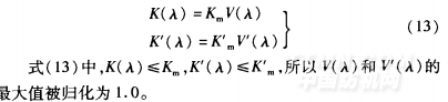 因為靈敏度可用匹配的待測光的輻射通量的倒數(shù)l/ 給出,所以比例常數(shù) 就與波長為^的人眼的靈敏度相對應,并稱K為光視效能(1uminous eficacy)。改變波長并重復以上實驗即可測得K作為波長的函數(shù)K(A),稱為光譜光視效能。進一步,將K(A)的最大值 稱為最大光視效能,并稱K(A)與 之比 (A)為光譜光視效率(spectral luminous eficiency)或視見函數(shù)。由于人眼有明視覺和暗視覺二重功能,所以光譜光視效率也有兩種,即 (A)和 (A),它們分別對應于明視覺和暗視覺,也可分別稱為明視見函數(shù)和暗視見函數(shù)。因此,明視覺和暗視覺的最大光視效能Km、K 和光譜光視效能K(A)、K (A)以及光譜光視效率 (A)、 (A)之間的關系式為: