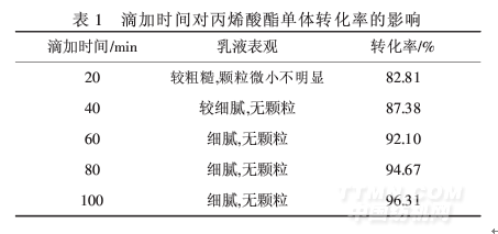 由表1可知,隨著滴加時間的延長,單體殘留量減少,轉(zhuǎn)化率提高.在滴加60 min時轉(zhuǎn)化率已達(dá)92.10%,但滴加時間過長,生產(chǎn)周期也延長,增加產(chǎn)品成本.考慮后續(xù)保溫階段可以進(jìn)一步提高單體轉(zhuǎn)化率,故選擇滴加時間為60 min.