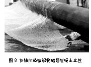 近年來(lái),多軸向經(jīng)編織物正越來(lái)越多地用在增強(qiáng)混凝土上,用于重建和修復(fù)建筑物。在馬利莫7F機(jī)器上可以生產(chǎn)這種增強(qiáng)織物,常用的是四軸向織物,在其縱向(0o)、橫向(90o)和斜向(±45°)都有增強(qiáng)紗線。增強(qiáng)的具體方法是在混凝土立柱的整個(gè)長(zhǎng)度方向上包覆一層該多軸向經(jīng)編增強(qiáng)織物,這樣可以恢復(fù)其穩(wěn)定性,同時(shí)還能夠抵御扭轉(zhuǎn)應(yīng)力和彎曲應(yīng)力,如圖8所示。