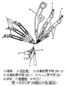 RJPC 4F 賈卡經(jīng)編機(jī)由地梳( 1 )、壓紗板( 2 )、分離的賈卡梳 JB1.2 ( 3 )、分離的賈卡梳 JB1.1 ( 4 )、 Piezo 賈卡梳 JB ( 5 )、織針( 6 )、脫圈梳( 7 )和針芯( 8 )組成。該機(jī)采用復(fù)合針,并且單針插放。針芯采用 1/2 英寸寬度的針塊。采用組合式賈卡梳櫛,由兩個(gè)分離的賈卡梳 JB1.1 和 JB1.2 組合而成。所有成圈機(jī)件都由封閉油箱中凸輪或者曲柄控制。 RJPC 4F 賈卡經(jīng)編機(jī)的賈卡梳僅作橫移,不作擺動;壓紗板作上下運(yùn)動, 3 把地梳既擺動又橫移。