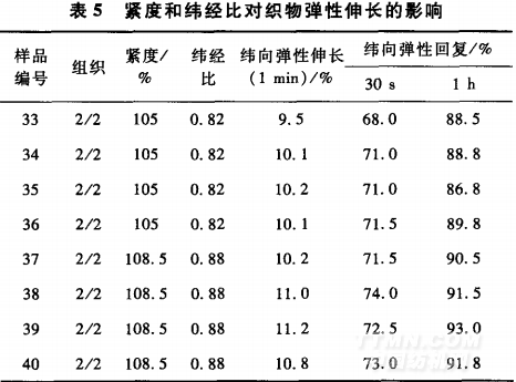 在其他參數(shù)不變的情況下,組織結(jié)構(gòu)對織物的緯向彈性影響比較大。平紋組織,單面嗶嘰2/1,雙面組織2/2,2/2變化組織對織物彈性伸長的影響見表6。由表6可以看出,結(jié)構(gòu)較松及長浮線織物,緯向伸長和回復(fù)率比較好…。