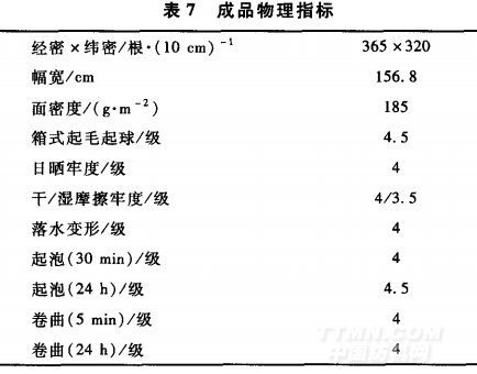 成品物理指標數(shù)據(jù)見表7。 成品各項指標符合日本檢測項目標準,產(chǎn)品的實物質(zhì)量,尤其是彈性、懸垂性比較理想。