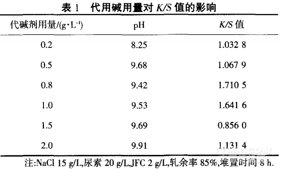 由表1可以看出,隨著代用堿用量的增加,K/S值 增加,O.8 g/L時(shí),K/S值達(dá)到最大值,繼續(xù)增加代堿劑 用量,則K/S值下降.因?yàn)榇脡A用量增加,染液的pH :L~Dil,纖維素羥基離解的數(shù)量增多,纖維與染料之間 共價(jià)結(jié)合的速度增加,所以K/S值提高,但代用堿用量 太大,染液的pH大,雖然提高了染料和纖維共價(jià)結(jié)合 的速度,但染料的水解速率也在同時(shí)增加,致使K/S值 反而下降.所以,代用堿用量以0.8~1.0 g/L為宜.。