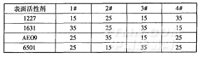由于柔軟劑都是陽離子或弱陽離子型產(chǎn)品,所以起泡劑不宜選擇陰離子型表面活性劑。各取質(zhì)量濃度為10g/L陽離子型表面活性劑1631、1227和非離子表面活性劑AEO9和6501,其發(fā)泡各項(xiàng)指標(biāo)見表7,柔軟起泡劑的配方見表8,不同配方起泡劑的發(fā)泡性能見表9。