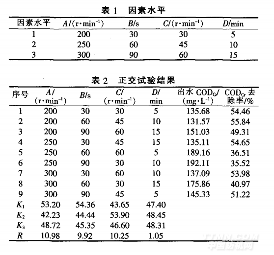 根據(jù)表2可知:各因素對混凝效果的影響順序 為A>C>B>D。水平優(yōu)選組合為AlB1C2D2,相應(yīng)的G 值為27.05 S-1。GT值為1.62xl(i4。 整體來看.在當(dāng)前試驗條件下攪拌方式對CODn的去除效果影響不大。為節(jié)省動力費用,最佳攪拌方式選擇快速攪拌速度200 r/min,攪拌30 S,慢 速攪拌速度45 r/rain,攪拌10 min。