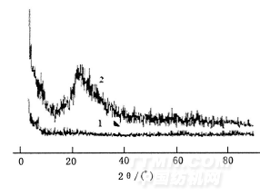 將制得的TiO2/EP催化劑采用X射線衍射(XRD)方法,在粉晶衍射儀上進(jìn)行晶相分析,結(jié)果見圖1。從圖1可以看出,珍珠巖的XRD圖譜中沒有出現(xiàn)其任何特征衍射峰,而用微波法制備的TiO2/EP催化材料則于2θ=25.4°處出現(xiàn)明顯的衍射峰。另外,根據(jù)掃描電鏡照片可以看出, TiO2呈球狀顆粒覆蓋在膨脹珍珠巖表面,粒徑在1~2μm,且分布均勻。這說明利用微波法已成功制得了TiO2/EP催化劑。