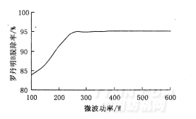 微波是一種高頻電磁波,能深入到樣品內(nèi)部使其中心溫度迅速升高,它能在很短的時(shí)間內(nèi)使整個(gè)樣品幾乎同時(shí)被均勻加熱,大大消除反應(yīng)的溫度梯度。從圖2看出,隨著微波功率的增加, TiO2/EP催化劑對(duì)羅丹明B的脫色率也隨之增加。當(dāng)微波功率為230~250W時(shí),脫色效果達(dá)到最佳,再繼續(xù)增加微波功率,脫色率增加不明顯。考慮降低能耗、節(jié)省能源,微波加熱功率確定為240W。
