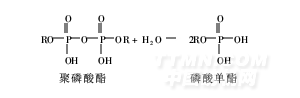 在生成物中,聚磷酸酯在一定條件下可以水解為相應(yīng)的單酯,單酯鹽含有2個(gè)親水基團(tuán),而雙酯鹽只含有1個(gè)親水基團(tuán),故單酯鹽比雙酯鹽的滲透性更好[3]。其水解反應(yīng)式為: