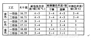 表7一浴二步法與二浴法得色量及色牢度(未經(jīng)固色處理)