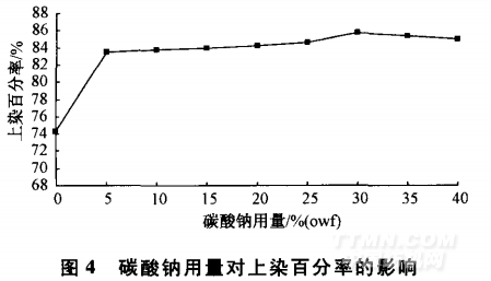 由圖4可知,不加碳酸鈉時,羊毛纖維的上染百分率只有74.26%;隨著碳酸鈉用量的增加,上染百 分率逐漸升高,當碳酸鈉用量為30%(owf)時上染 百分率達到最高85.78%,繼續(xù)增加碳酸鈉用量,上 染百分率有下降的趨勢。這是由于碳酸鈉作為催化 劑,能夠使WLS中的環(huán)氧基開環(huán),隨著碳酸鈉用量 的增加,WLS中的環(huán)氧乙烷活性基團與羊毛纖維間 形成的交聯(lián)共價鍵數(shù)量增加,改性程度提高,上染百 分率提高;但碳酸鈉用量太大,上染百分率有所下 降,原因是堿用量太大,WLS水解速率增大,同時纖 維和WLS的共價鍵有可能發(fā)生斷鍵。因此,碳酸鈉 最佳用量確定為30%(owf)。
