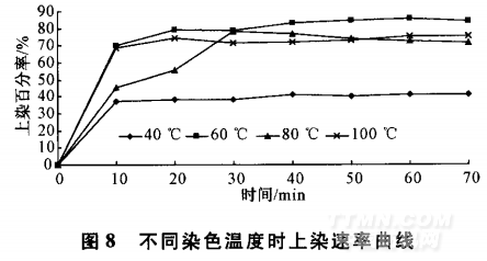 按照2.2確定的工藝對羊毛纖維改性,然后按照1.2.3工藝染色,石榴皮色素用量均為10 mL,得到不同染色溫度時的上染速率曲線,如圖8所示。