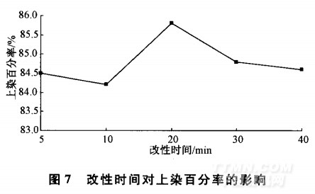 由圖6可知,隨著改性溫度的升高,羊毛纖維的 上染百分率增加,當溫度為60℃時達到最高;溫度 繼續(xù)升高,上染百分率有所下降。原因是隨著改性 溫度的升高,WLS向纖維表面吸附速率和擴散速率 加快,同時與纖維結(jié)合的速率加快,增強了改性程 度,使羊毛纖維上引入更多正電荷,從而增大了色素 與羊毛纖維之間的作用力,使上染百分率提高;當改 性溫度過高,助劑在堿液中水解速率加快,改性效果 降低,使其與陰離子染料間的親和力減小,導(dǎo)致染色 性能下降。因此最佳改性溫度為6O℃。2.2.5改性時間的優(yōu)選 按照1.2.2工藝,采用一浴一步法的改性工藝方法,在60 ℃條件下將羊毛纖維投入到用量10%(owf) WLS和30%(owf)碳酸鈉的改性浴中,處理5~40 min,然后按1.2.3工藝染色,在溫度為70℃,石榴 皮色素為10 mL條件下染色40 min,最后測定改性時 間對上染百分率的影響,結(jié)果如圖7所示。