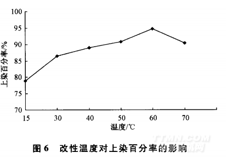 2.2.4 改性溫度的優(yōu)選 按照1.2.2工藝,采用一浴一步法的改性工藝, 在不同溫度條件下將羊毛纖維投入到用量10%(owf)WLS和30%(owf)碳酸鈉的改性浴中,處理20 min,然后按1.2.3工藝染色,石榴皮色素為10 mL,在溫度為70℃條件下染色40 min,最后測定 不同改性溫度時羊毛纖維的上染百分率,結(jié)果如圖6所示。