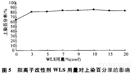 由圖5可知,不加WLS時,上染百分率僅為64.63%,隨著WLS用量的增加,上染百分率逐漸增 加,當用量為10%(owf)時羊毛纖維的上染百分率 可達85.83%,繼續(xù)增加WLS用量,上染百分率幾 乎不變。原因是隨著WLS用量增加,纖維上結(jié)合的 助劑量增多,纖維引入的正電荷亦增多,從而使染料 結(jié)合量增多。但在一定濃度的堿液中,纖維素上的 羥基發(fā)生離解,生成一定量的Cell—O-,使得反應(yīng) 達到平衡時所消耗的改性劑有飽和值。綜上所述,WLS最佳用量確定為10%(owf)。