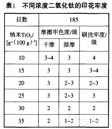 表1是不同濃度二氧化鈦對(duì)印花牢度的影響。從表1看出,實(shí)驗(yàn)中選 擇了6個(gè)不同的濃度,用185目網(wǎng)進(jìn)行 印花后分別測(cè)試了干摩擦、濕摩擦和 刷洗牢度。比較各濃度的印花后牢 度,得出納米二氧化鈦濃度在10~25g/(100 g)時(shí)的各項(xiàng)牢度較好;而濃度超過(guò)25g/(100g)時(shí),各項(xiàng)牢度開(kāi)始下降。這可能是由于納米材料濃度升高,在織物表面產(chǎn)生聚集現(xiàn)象引起的,所以從實(shí)驗(yàn)的結(jié)果看,應(yīng)把二氧化鈦濃度選在10~25g/(100 g).