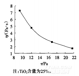 2.1添加了二氧化鈦原糊的流變性 用NDJ一1型黏度計(jì),選取合適的轉(zhuǎn)子,分別以6 r/min、12 r/min、30 r/min、60 r/min等4檔不同轉(zhuǎn)速下測(cè)黏度;以對(duì)應(yīng)上述4檔轉(zhuǎn)速下的速度 】.256 S-1、2.512 s-1、6I28 s-1、12.58 s-1,按照下式計(jì)算相對(duì)應(yīng)的剪切應(yīng)力, 并作圖1。