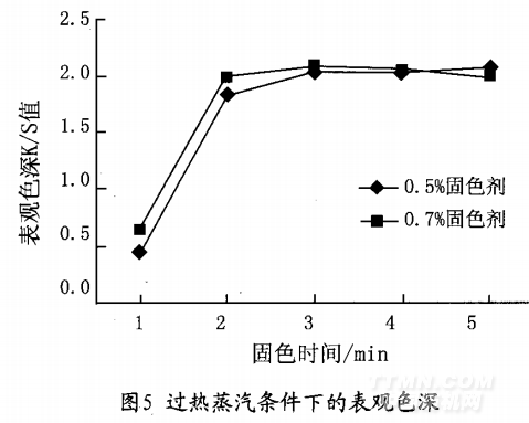 從圖5看出,當(dāng)施加0.5%的固色劑時,在固色時 間低于2min時,表觀色深即K/s值逐漸增加,增加的 趨勢顯著;在固色時問為2min時,K/S值達(dá)到了一個 最大值;在固色時間高于2min后,K/S值不但幾乎沒 有增加反而有所下降,但是整體趨于一個平衡值。 當(dāng)施加0.7%的固色劑時,在固色時間低于2min時, K/S值逐漸增大,增加的趨勢顯著;在固色時間為 2min時,K/S值為一個轉(zhuǎn)折值,但是沒有達(dá)到最大; 在固色時間高于2min時,K/S值依然在增加,但是增 加的趨勢越來越小。 因此可知固色劑用量的多少對固色時間的選擇 沒有影響,同時也可知在活性染料二相法印花中, 在過熱蒸汽條件下,適宜的固色時間是2min。