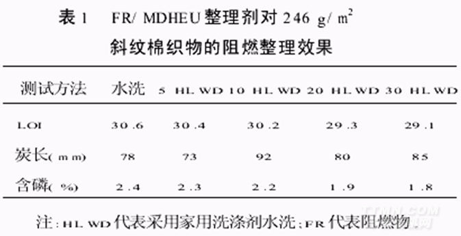 表1描述了典型的使用DMDHEU交聯(lián)體系和阻燃劑對斜紋棉織物的整理。混合物中含有32%阻燃劑,16%DMDHEU樹脂,8%催化劑,0.01%潤濕劑,帶液率<80%(基于織物原始重量),pH值調節(jié)至2.8(加三乙醇胺),織物在60℃烘3min,在160℃焙烘3min,在40℃用家用洗滌劑清洗。正如數(shù)據(jù)所示,在30次家用洗滌后,織物的阻燃耐久性及LOI、垂直燃燒測試結果都很好。