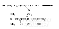 將二甲胺溶于水后,加入四口反應(yīng)瓶中,開(kāi)動(dòng)攪拌并升溫.控制一定溫度,在合適時(shí)間內(nèi)將環(huán)氧氯丙烷滴加到反應(yīng)瓶中.環(huán)氧氯丙烷加完后保溫2h,冷卻至室溫后用冰醋酸調(diào)節(jié)pH至5~6,出料得無(wú)醛固色劑LDE(以下簡(jiǎn)稱(chēng)固色劑),反應(yīng)式如下: