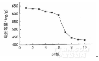 由圖3可知,隨pH值的增加,復(fù)合微球?qū)λ嵝约t337的吸附容量逐漸減少,當(dāng)pH值大于5時(shí),復(fù)合微球的吸附容量迅速下降。雖然pH值為1時(shí)吸附容量最高,但酸性太強(qiáng)不利于復(fù)合微球的穩(wěn)定,因此復(fù)合微球較適合的pH值為2~3。