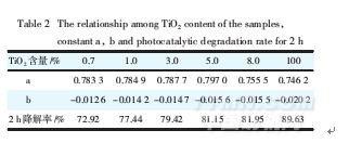表2試樣中TiO2含量與常數(shù)a、b及樣品2h光催化降解率的關(guān)系