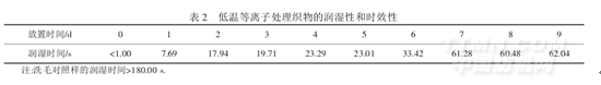 蛋白酶處理前進(jìn)行預(yù)處理,使羊毛鱗片外角質(zhì)層中的二硫鍵打開,提高羊毛的親水性,使蛋白酶容易接近蛋白質(zhì)分子鏈,發(fā)生吸附和催化反應(yīng).[8]傳統(tǒng)采用H2O2預(yù)處理與蛋白酶結(jié)合.本文采用低溫等離子作為蛋白酶的預(yù)處理,分析低溫等離子-蛋白酶聯(lián)合改性對(duì)羊毛性能的影響,結(jié)果如表3 所示.