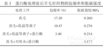 2.2 低溫等離子-蛋白酶聯(lián)合改性對(duì)羊毛針織物性能的影響