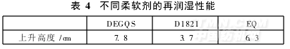 由表4可知,織物用柔軟劑處理后,與常用柔軟劑D1821和EQ比較,DEGQS的再潤濕性較好,是D1821的2倍多。這可能是因為DEGQS具有較好的水溶性,附著在織物表面使其再潤濕性增強。