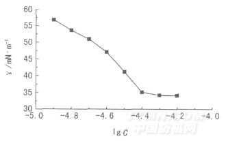 配制不同摩爾濃度(C/mol·L-1)的DEGQS溶液,以其對數(shù)為橫坐標,用QBZY-1全自動表面張力儀測定表面張力(γ),作為縱坐標,作γ-lgC關(guān)系曲線,見圖3。
